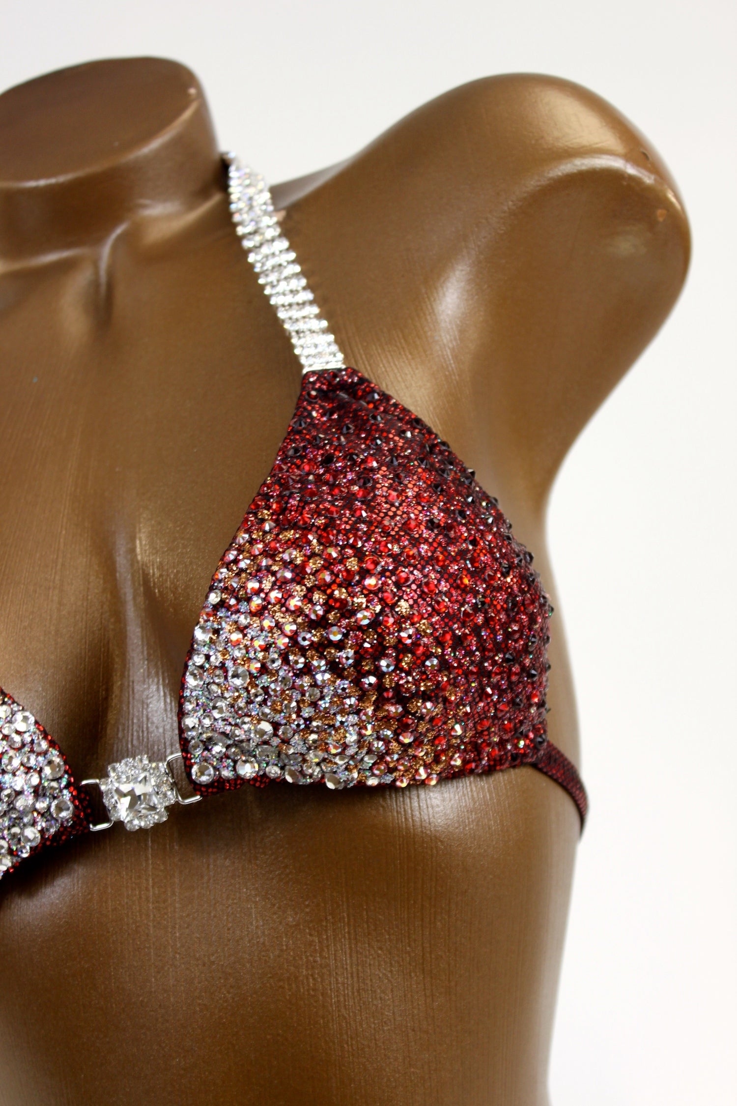 - Features: Triple crystal clear rhinestone connector at hips & bra, decorated with crystal clear, hyacinth AB, red & deep red rhinestones, sparkling glitter detail, scrunch back, rio back coverage