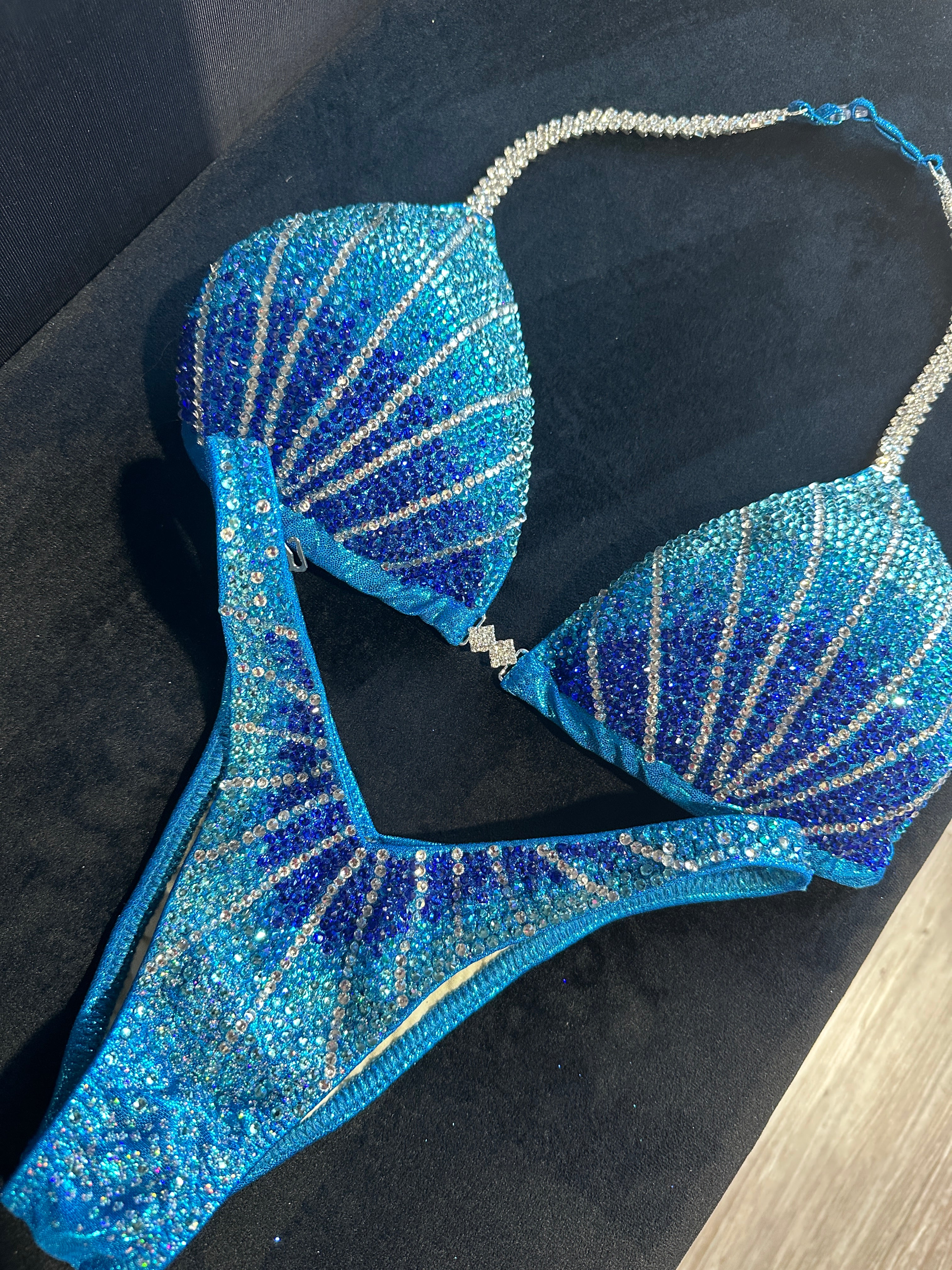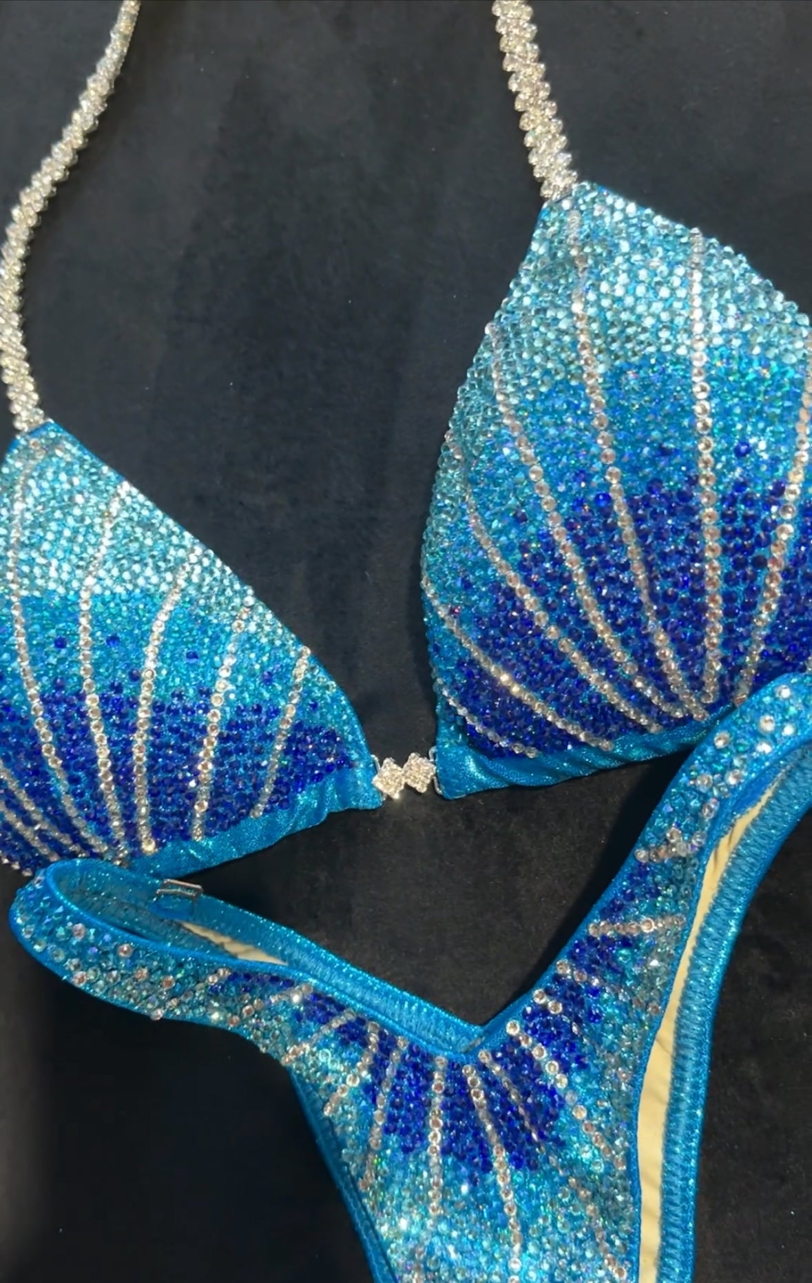 Show off your gorgeous physique with our Aqua Wave Inspired Figure Competition Suit. Tailored for athletes who grace the stages of prestigious bodybuilding and fitness organizations- NPC, IFBB, WBFF, OCB, or Muscle and Fitness Contests. This suit merges the essence of competitive spirit with oceanic elegance.