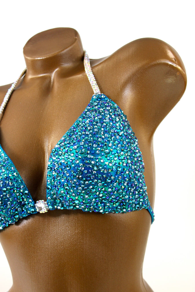 - Features: Double close up crystal AB rhinestone connectors at hips & bra, rhinestone square center connector, decorated with indicolite, bermuda blue, light aquamarine, teal & emerald AB rhinestones, scrunch back, pro cut rio back coverage