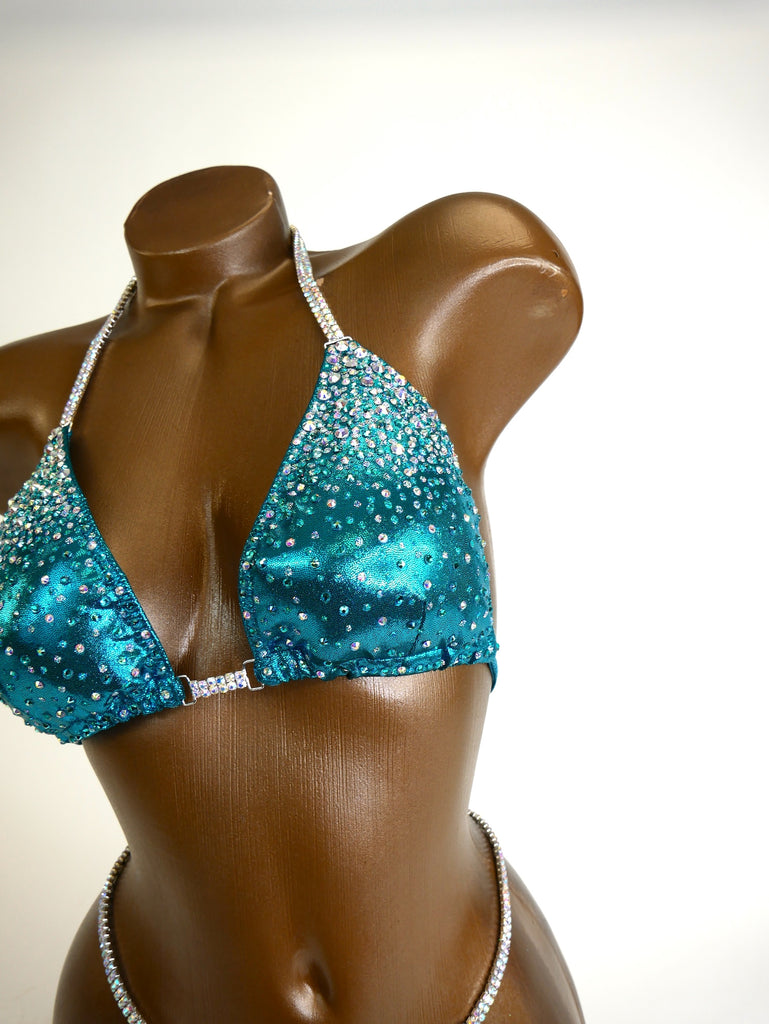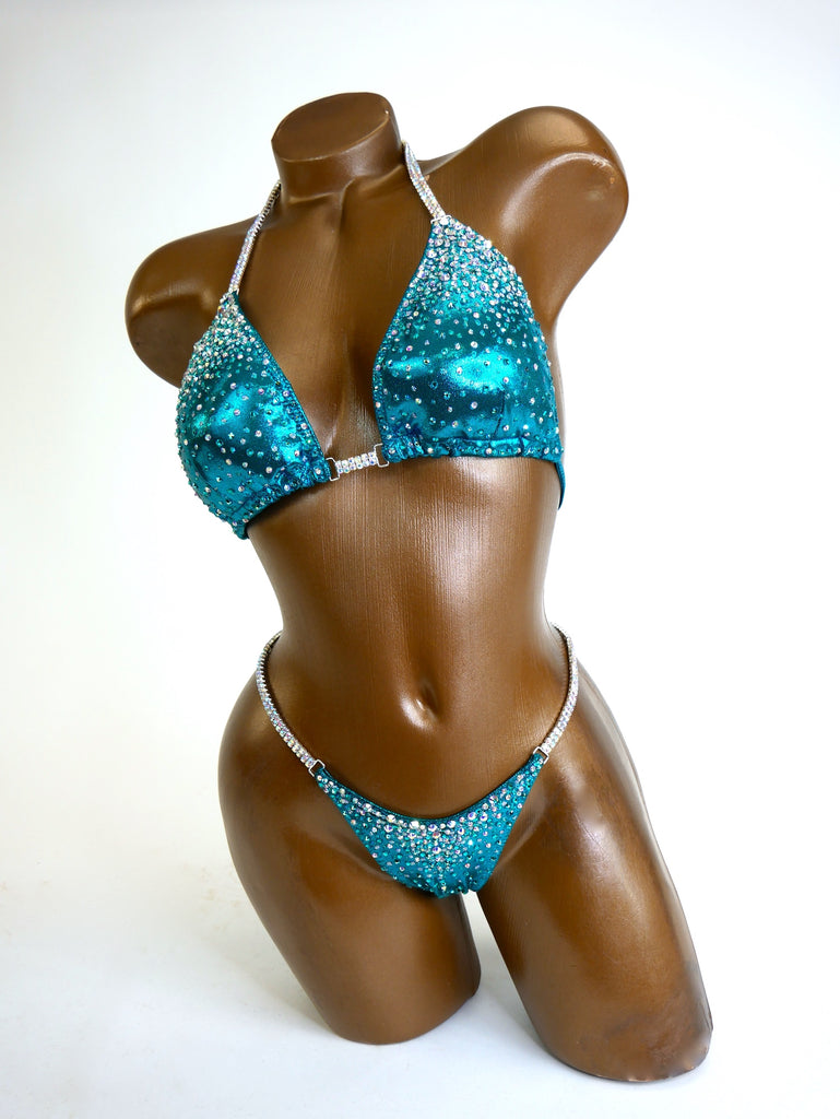 - Features: Double close up crystal clear connectors at bra and hips, decorated with crystal AB & teal rhinestones, sparkling glitter detail, Rio Pro back coverage, fully lined