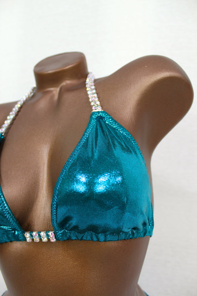 - Features: Double crystal AB rhinestone connectors at the hips and bra, scrunch back, moderate back coverage