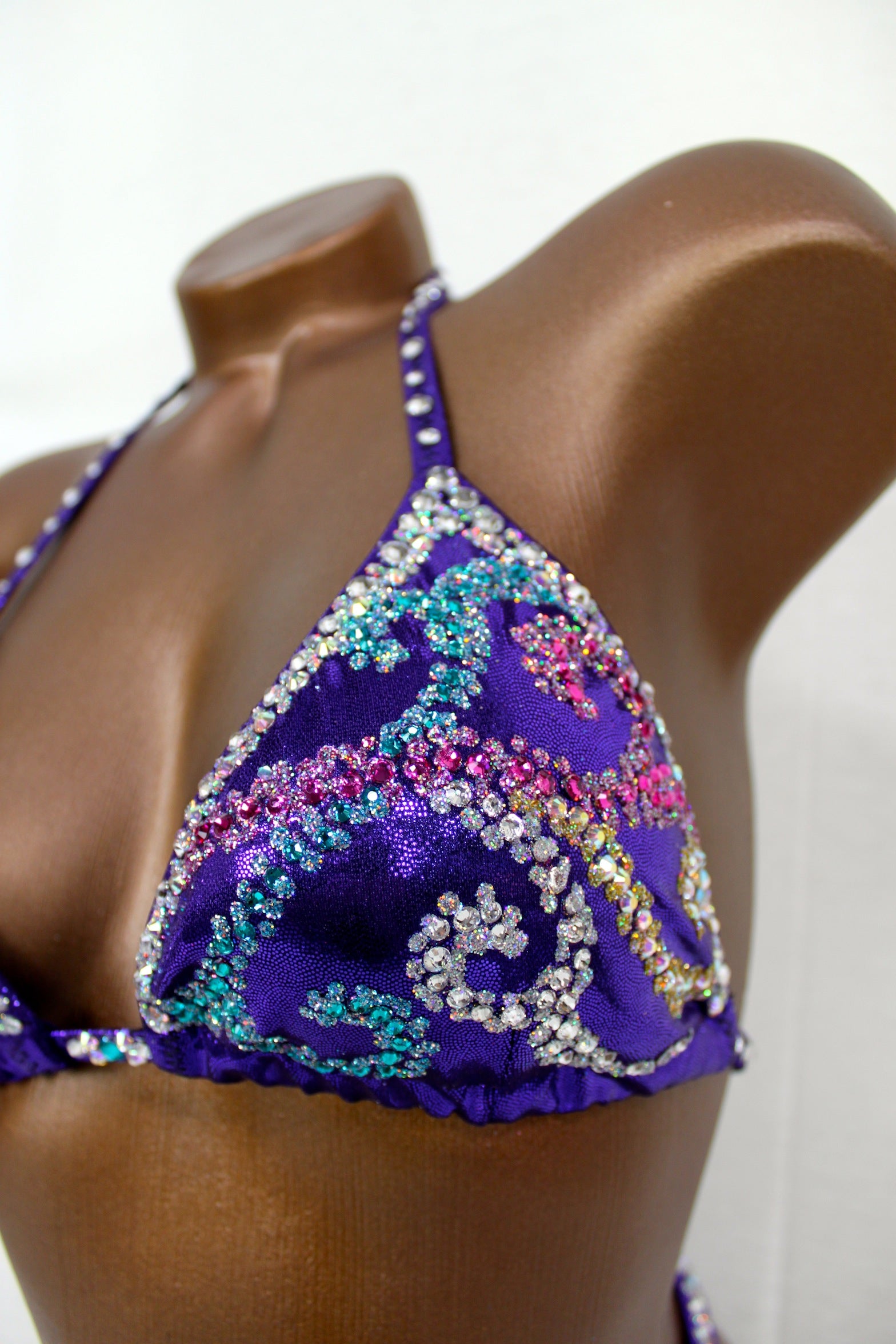 - Features: decorated with crystal clear, teal & rose rhinestones in various sizes, sparkling glitter detail, moderate back coverage, fully lined